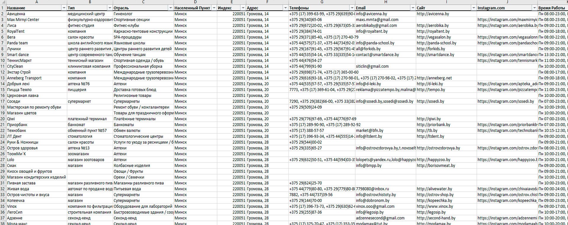 Все данные сохранены в формате Excel, включают детальную информацию о каждом предприятии, включая его название, адрес, направление деятельности, контакты, адреса электронной почты и веб-ресурсы. Информация разнесена по отдельным колонкам, благодаря чему фильтрация и упорядочивание по требуемым параметрам упрощается и ускоряется. К примеру, за несколько секунд можно получить полный перечень организаций в определенной сфере, применив фильтр по типу деятельности.